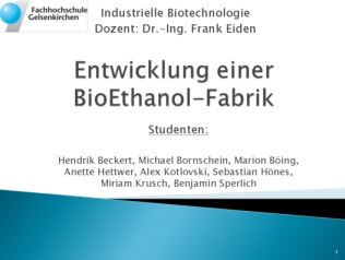 Apparaturen s.u. >>> Gruppenarbeit <<< Im Rahmen der Gruppenarbeit, soll eine BioEthanol-Fabrik projektiert werden. Hierzu sollen die einzelnen Gruppen (3, ggf. 4) die einzelnen Prozesskomponenten zusammentragen, grob die Mengen abschätzen sowie die Schnittstellen definieren. Als Ergebnis ist eine Plant Design (Anlagenkomponenten, Stoffstromskizze) zu erstellen. Darüber hinaus sollen Abschätzungen zu den Stoffströmen und den Kosten ergänzt werden. Ein Zusammenfassung der einzelnen Komponenten ist in einem Bericht zusammenzufassen. Eine zusammenfassende Präsentation erfolgt im Rahmen der Abschlussveranstaltung. Der Erfolg der Gruppenarbeit wird bewertet und geht in die Abschlussnote ein. Die Gruppenarbeit wird teilweise von dem Unternehmen BlueSens GmbH aus Herten begleitet (hier bes. Abgasanalytik).